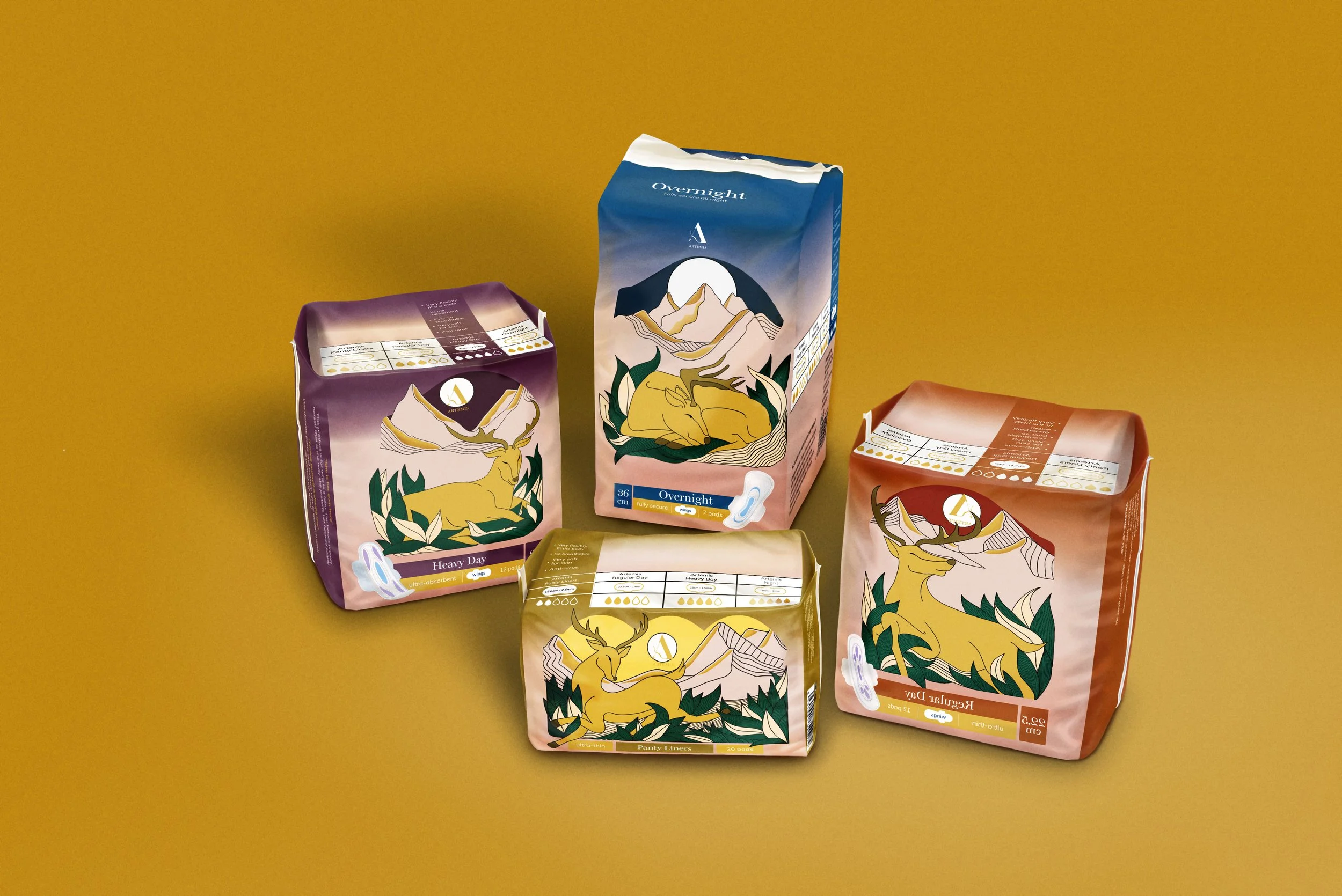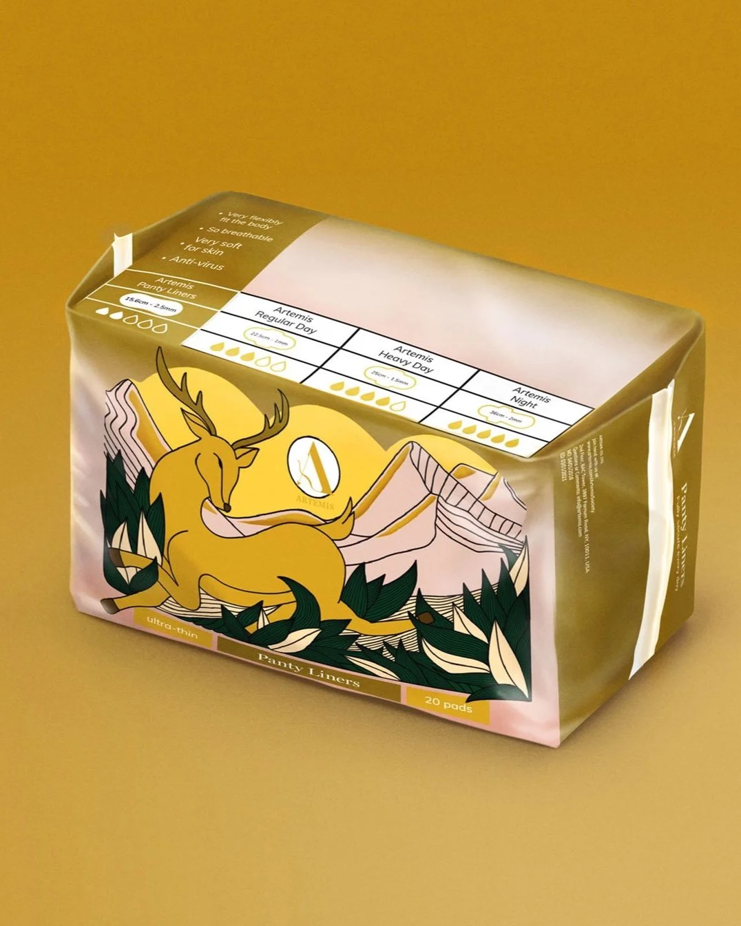 As the name implies, the brand Artemis provides sanitary care for women during their menstruation. It is as same as the Goddess of the Moon in Greek mythology - Artemis whose mission is also to protect women. The images related to Artemis are in the center of designs, the packagings are illustrated a hunting day of Artemis from day to night. The logo is a combination of the letter 'A' standing for Artemis and a bow, Artemis's weapon. The brand provide products are various that fully meet consumers' needs in their period. Four types of products are panty liners for everyday use, pads for normal day, heavy day and night corresponding to four different time of Artemis's hunting day which are morning, afternoon, evening and night. Each illustrated packaging portrays a deer, which is Artemis's favorite animal in different poses of running, standing, resting and sleeping in the forest.