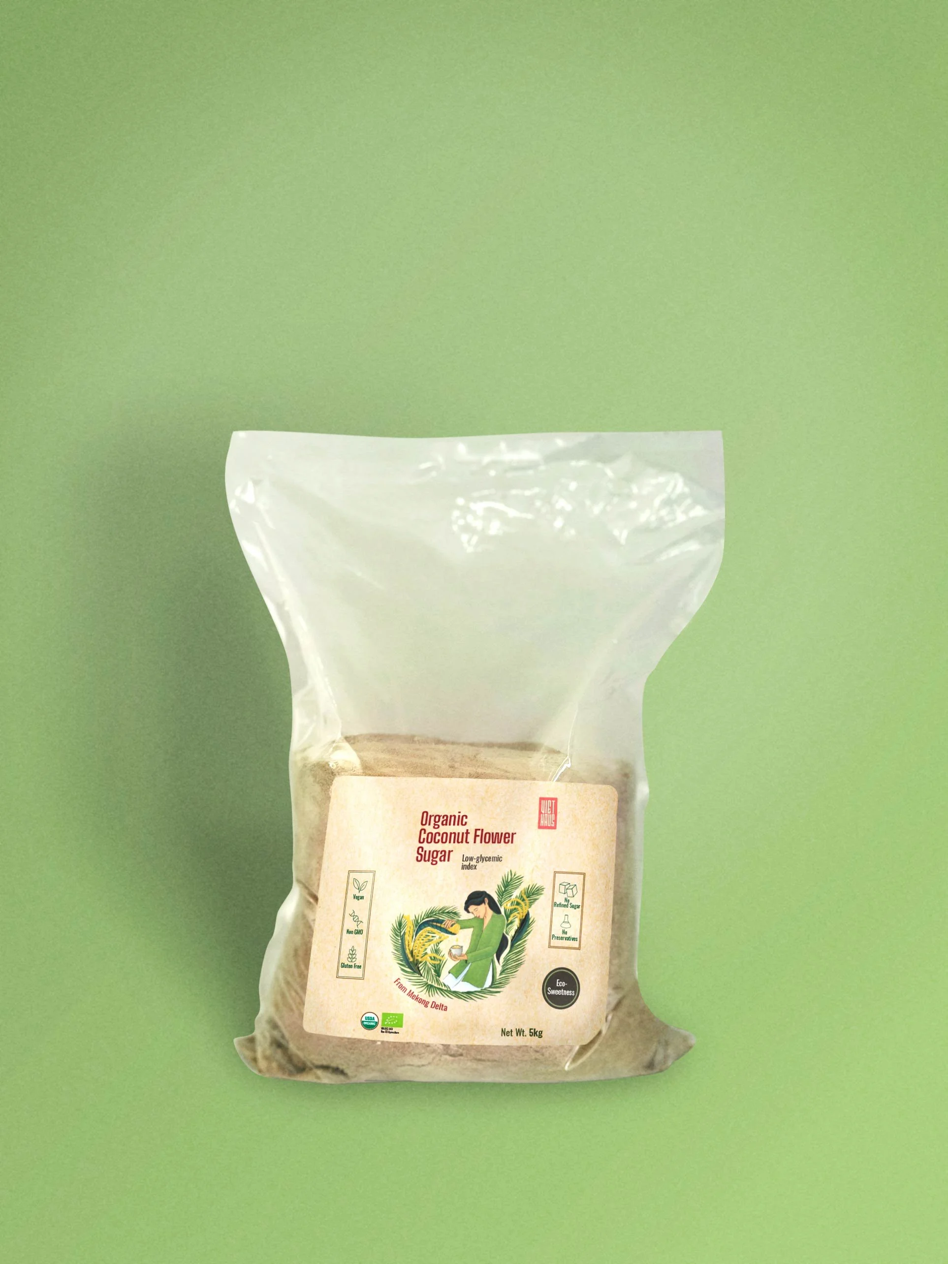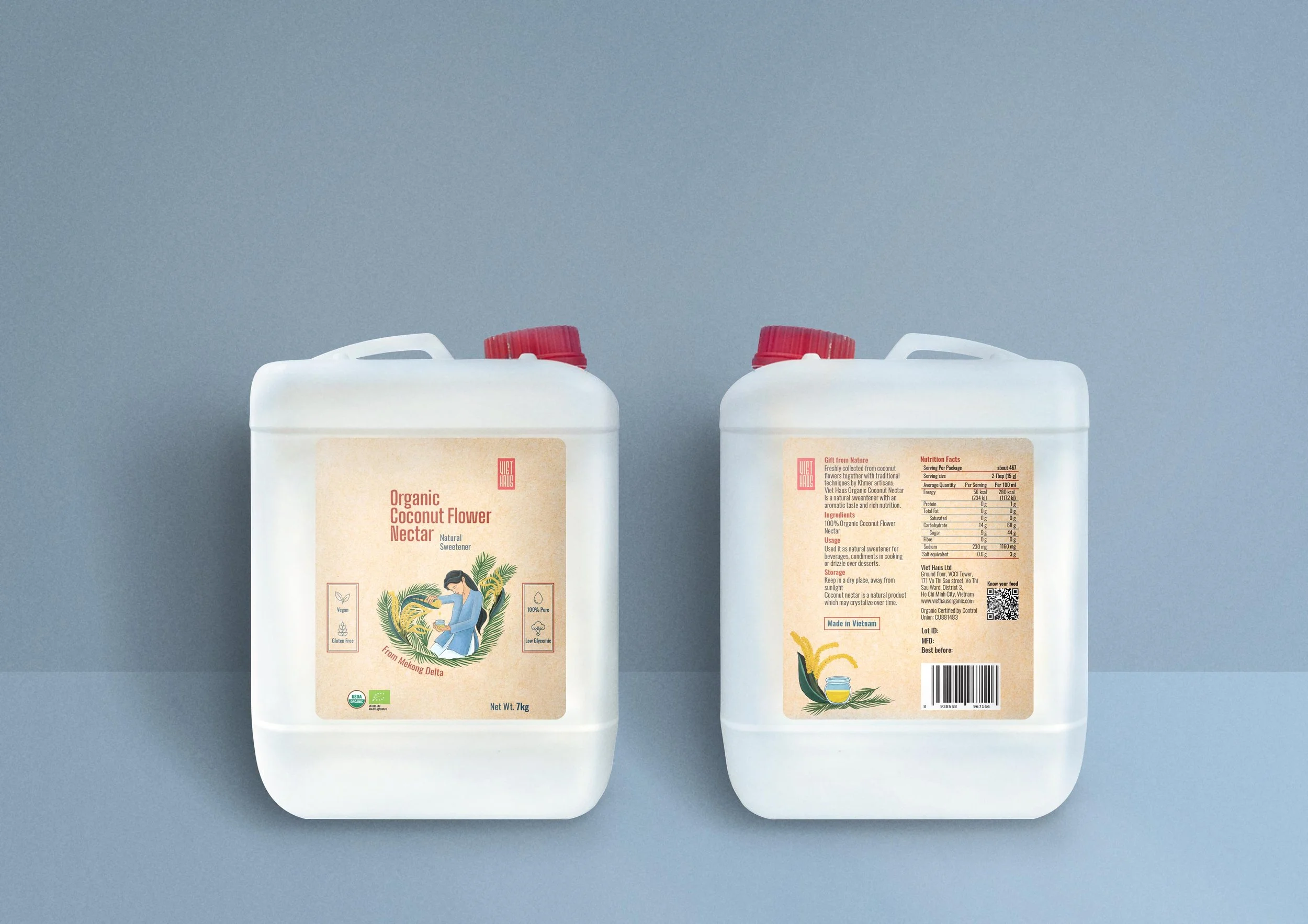 These are products made from organic coconut flower. Taking nectar of the coconut flower, they produce different products such as aminos, nectar, sugar and vinegar. The client chooses ordinary Vietnamese women to become the signature of the packaging; therefore, a young woman wearing Ao Ba Ba is selected. Coconut flowers are collected from Mekong Delta that is also one of the reasons to choose Ao Ba Ba, the traditional Vietnamese costume.